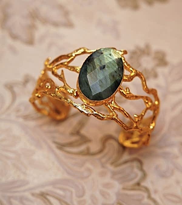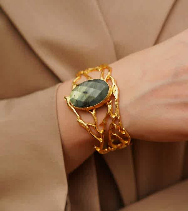 El Yapımı Altın Kaplama Pirinç Bileklik Labradorit Taşlı