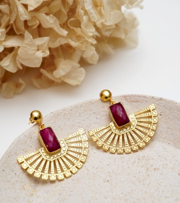 El Yapımı Çiçek Tasarımlı Yakut Taşlı Pirinç Küpe